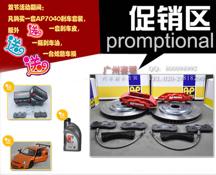 廣州賽驅(qū)汽車改裝貿(mào)易有限公司:九月促銷活動現(xiàn)正式開始!時間是9.21到9.30結(jié)束。活動促銷最劃算是AP7040大六剎車套裝主要促銷產(chǎn)品,現(xiàn)在購買即送超值大禮包!