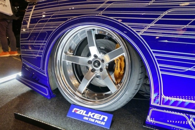 雖然有許多套件,但是卻沒有寬體套件,在眾多寬體改裝車中非常特立獨行!車輛使用了日本VERZ-WHEELS品牌21英寸輪圈,搭配日本FALKEN(飛勁)輪胎。而且剎車系統升級為Brembo的GT-S系列卡鉗,沒有搭配Brembo常規的打孔盤,反而選擇了劃線盤。