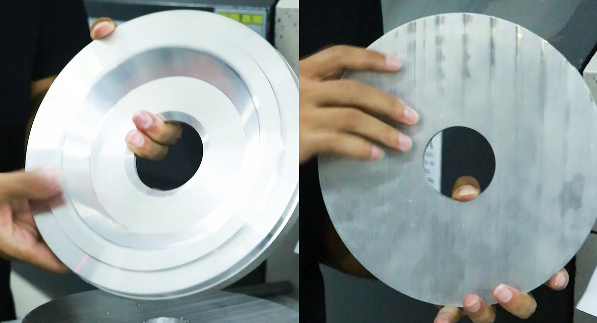 看到圖紙上的數(shù)據(jù),我們會(huì)先拿去車床加工出精準(zhǔn)的圓邊以及中心孔,這個(gè)步驟在CNC數(shù)控機(jī)床可以進(jìn)行更為精準(zhǔn)的校準(zhǔn),而且在CNC上需要地方來(lái)鎖住鋁餅經(jīng)行加工,加工好的這些地方可以提供更牢固,平面度最高的地方進(jìn)行加工,然后開始加工反面,一個(gè)合頭就是初始形狀就是這樣出來(lái)了!